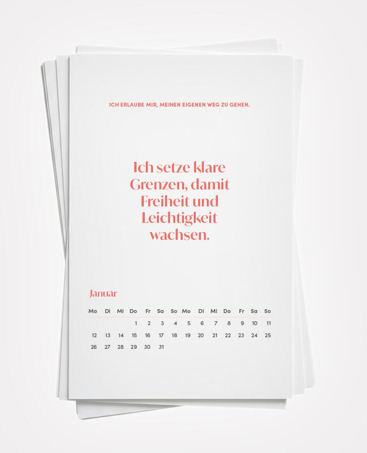 Das Kalender-Set besteht aus 12 einzelnen Monatsblättern, die du in einen eigens dafür hergestellten Holz-Halter stellst. Auf der Rückseite jeder Karte findest du drei Reflexionsfragen, die dich Monat für Monat tiefer führen: